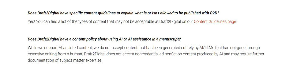 The biggest smoking gun on this AI excuse is on Draft2Digital's FAQ: they accept so-called "AI-assisted" books. They have no problem with books that are completely generated by AI so long as the book has gone through "extensive editing from a human."